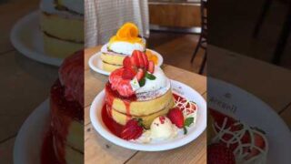 スィーツ 濃厚クリームをたっぷり盛り付けた極上いちごパンケーキ!自家製いちごソースのほどよい甘味も最高すぎる【アクイーユ:東京恵比寿】