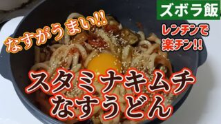 電子レンジレシピ 【ズボラ飯】にんにくを効かせたキムチうどんになすを加えました