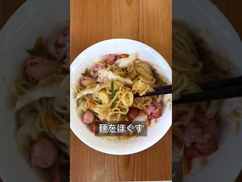 耐熱皿で焼きそばの麺1玉、市販のカット野菜適量、手でちぎったウインナー適量、ソース大さ…