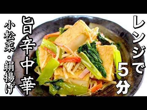 電子レンジレシピ今回はレンジで5分で出来る『小松菜と絹揚げのピリ辛蒸し煮』を紹介します。