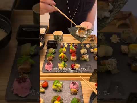 京都グルメ 手織り寿司専門店アウーム■いつも行列の大人気店 2024.11.15 京都烏丸 手織り寿司専門店 アウーム。普通の手巻き寿司とは全然違って野菜や果物、漬物、惣菜などを巻いて食べるスタイルで初めての組み合わせばかりでめちゃくちゃ新鮮だった。写真、マグロに見えるのは実はスイ…